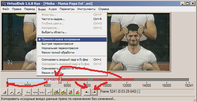 если из одного файла резать, то открываешь его удаляешь лишнее (2 кнопками обозначяешь откуда до куда и del жмёшь - удаляешь лишнее), Прямопотоковое копирование на аудио и видео и файл сохранить как