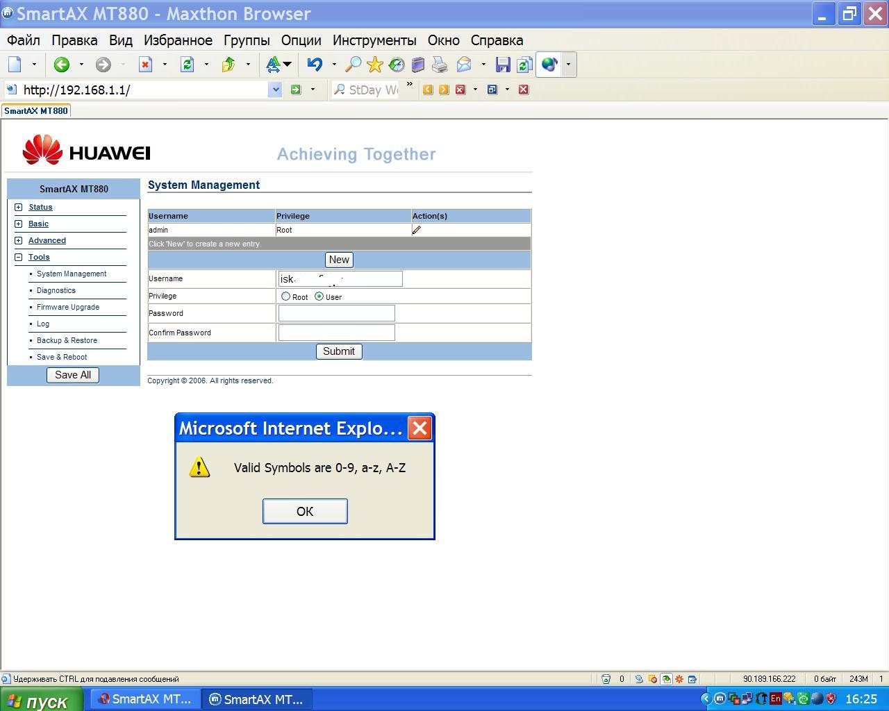 | ....опять тоже...Как Username admin вообше удалить? Модем новый с кнпочкой HUAWEI SmartAX MT880u ввожу логин из листа регистрации он вообще не хотит его регистрировать...... |