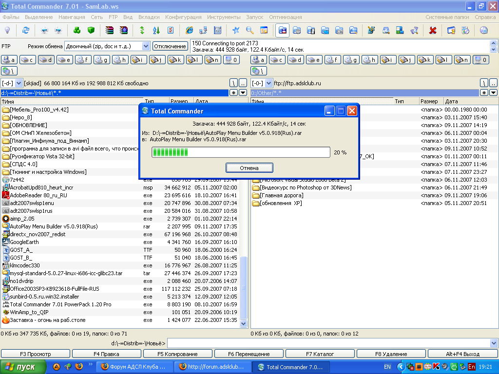 Тут жаловались, что закачка на ФТП замораживается. По моим наблюдениям это происходит, когда ФТП заполняется. Тогда следующий файл из очереди на закачивается на ФТП и Тотал как бы виснет. Приходится вручную отменять закачку и даже дисконнектиться и закрывать Тотал.