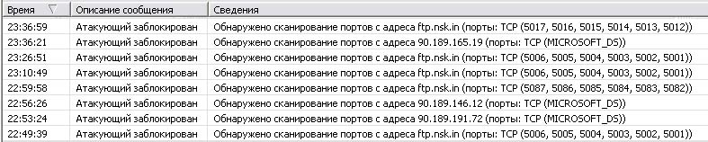 Захожу на FTP-сервер, начинаю закачку и файрволл выдаёт сообщение: «Атакующий заблокирован. Тип атаки: Сканирование портов. IP-адрес: 90.189.165.19 (или другой, или ftp.nsk.in). Просканированы порты: TCP (MICROSOFT_DS) (или 5006, 5005, 5004, 5003, 5002, 5001)».