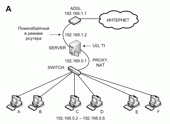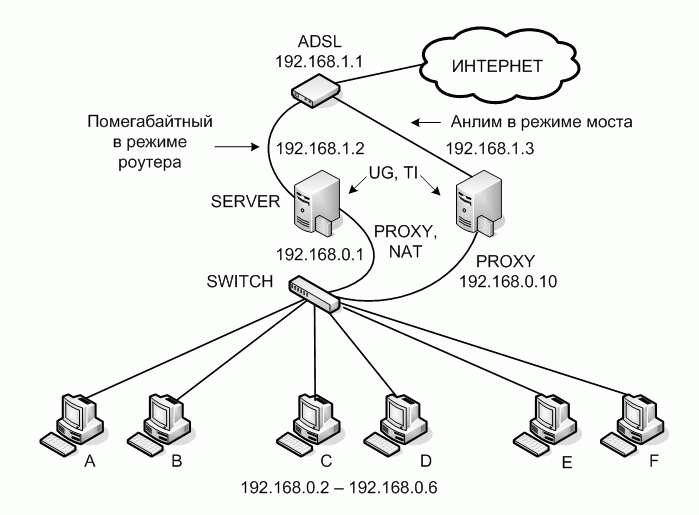 Сейчас всё работает примерно так - машины А и В работают по NAT через чистый ADSL, C и D работают через PROXY каскадированный на спутник, Е и F могут использовать как NAT так и PROXY.