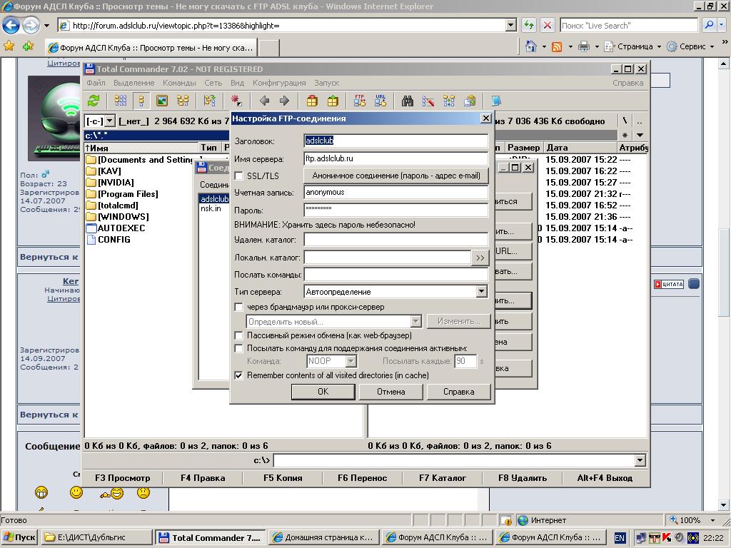 Дело в том, что я хочу скачать музыку с ftp, через некоторое время подсоединяюсь, слева появляются папочки, как в инструкции, но как только я навожу на папку и пытаюсь с ней что-то делать мне пишут: соединение с сервером потеряно, повторить? Так постоянно! Что делать? |