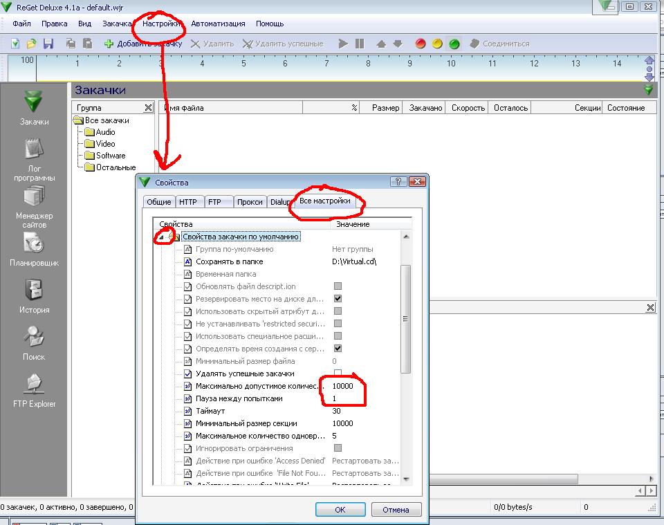 | как и всё остальное - по умолчанию задаешь на ftp логин и пароль, убираешь зеркала, делаешь попытки соединения бесконечными и через одну секунду. где все эти опции находятся зависит от версии. |