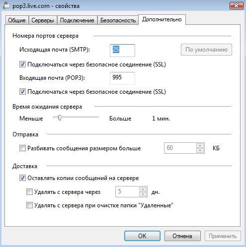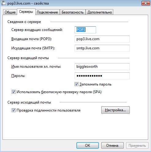Вот настройки, они не совпадают с большнством серверов (yandex, mail, 1nsk), но такие были указнны на сайте майкрософта в справке по натройке аутлука.