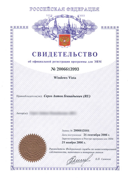 По утверждению Антона Серго, президента компании «Интернет и право», Федеральная служба по интеллектуальной собственности, патентам и товарным знакам (Роспатент) зарегистрировала на него программу для ЭВМ Windows Vista. CNews получил изображение соответствующего свидетельства за номером 2006613993 от 21 ноября 2006 г.