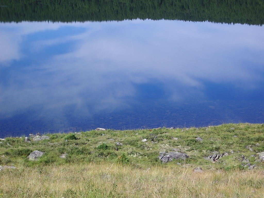 Вода настолько чистая..что камушки дна просматриваются даже на самой большой глубине озера...доплывали..проверяли...;) даже мерили глубину камушком на верёвочки...10,5 метров..кажется..получилось ;) |