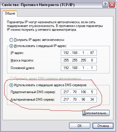 в свойствах сетевого подключения -> свойство TCP/IP ->