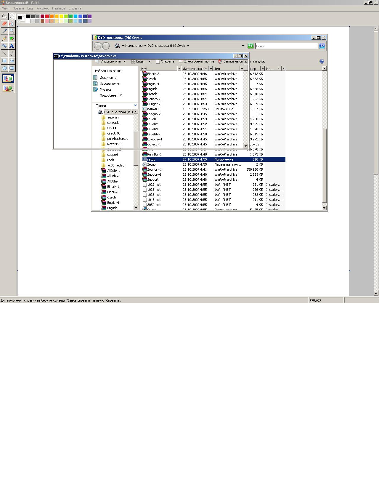 Эта надпись в заголовке черного окна, всегда только она появляется или меняется? Пробовал запускать setup'ы с других дисков, они нормально работают? В диспетчере задач процессор "ntvdm" висит и много ли он жрет ресурсов? |