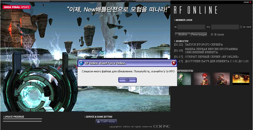 Скачал РФО с 1nsk.ru, распаковал, установил патч. Запускаю, а он мне кричит: "слишком много файлов для обновления" Че делать я безпонятия, ужо погамать охота