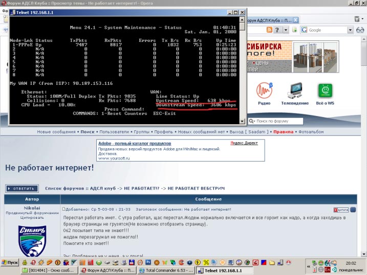 | Сменили логин и еще сказали поменять в модеме vpi/vci все сделал и скорость скачивания упала на 100 кбайт...было 340 стабильно, сейчас и до 200 еле дотягивает...а SNR на Upstream в модеме упал аж до 8 dB...кого долбить свой узел связи (живу в области) или Новосибирск, ибо в Новосиб сегодня звонил мне там невнятно промямлили, "что это бывает", но до смены этого треклятого логина такого не было!!! |