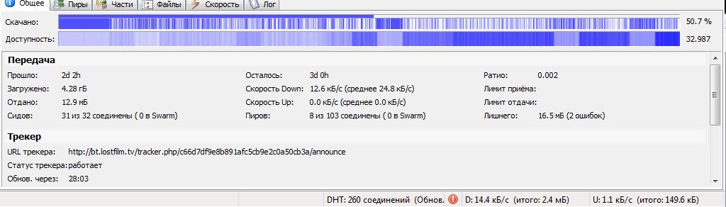У меня тоже скорость последнее время выше 40кбайт не поднимается, что то меня это напрягает.. Причем когда качается, что-либо то зайти на какой-нибудь сайт не возможно.... А вечером скорость так вообще 20кБАЙТ в секунду и это на тарифе Трасса 1024=650 рублей... И это с торрента. Доктора Хауса 5 сезон уже 2 суток качаю... Обратите внимание на среднюю скорость загрузки...