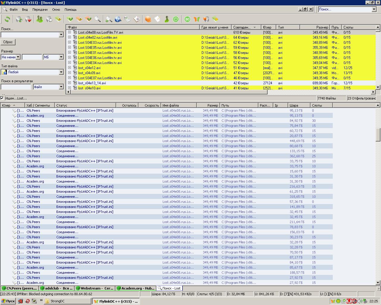 Flylink DC++ просто игнорирует альтернативы, пишет "блокировано Flylink DC++ [IPTrust.ini]. Понятия не имею что это значит, но когда файл есть у 300-350 юзеров, качает в лучшем случае с 5-6. Пирсы Эг и Академа блокируются, причем с меня качать могут, а я не могу. Помогите кто шарит, я в п2п вобще ламак