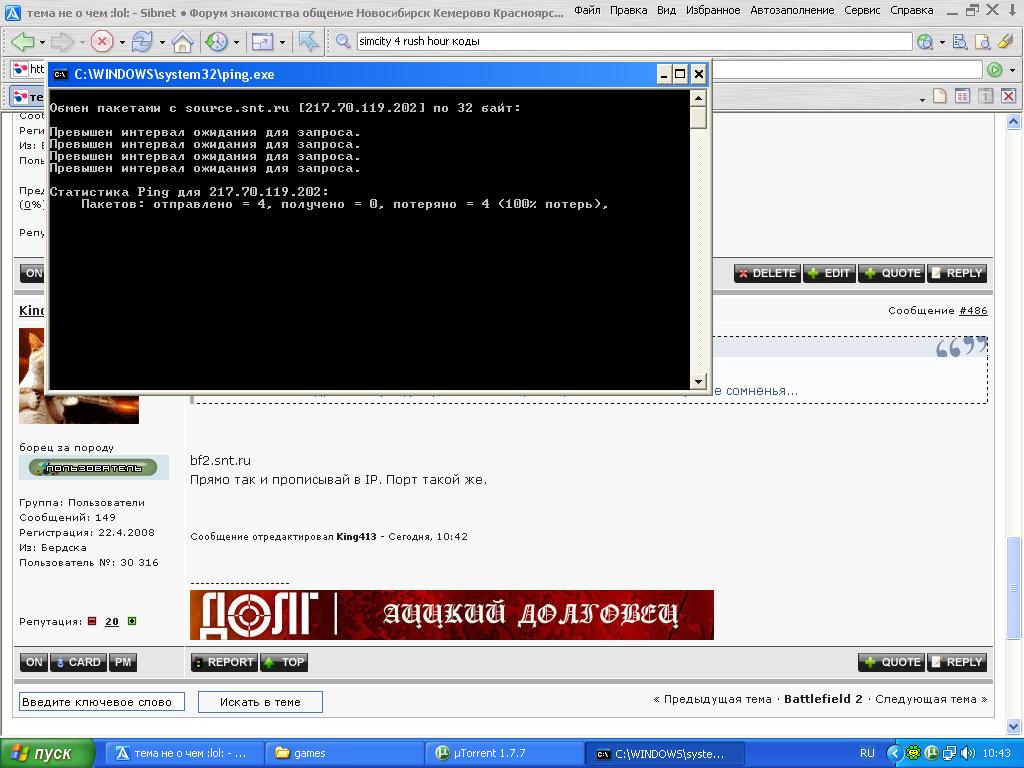 Он не только перестал открываться но ещё и не пингуется, игровые серверы СНТ у меня не работают. Помогите разобратся, играть хочется