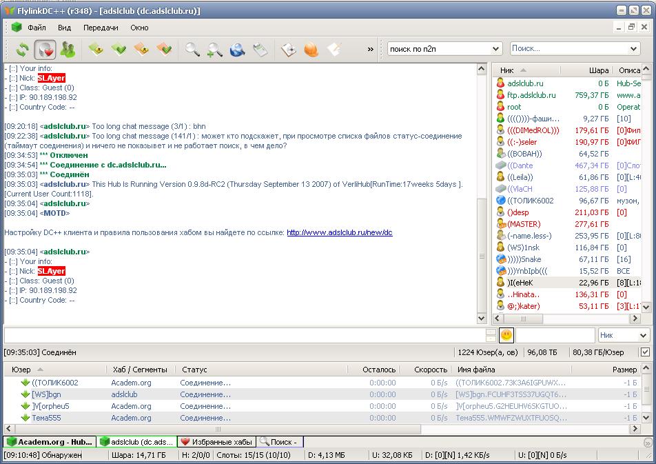 Народ, подскажите в чем проблема, FlinkDC++ показывает подключенных пользователей, но при просмотре списка файлов не соединяет. Статус-Соединение(Таймаут Соединения) и поиск не работает. В фаерволе прописал, настройки по инструкции, может чего пропустил, подскажите Сижу на Вебстриме. Скрин прилагаю