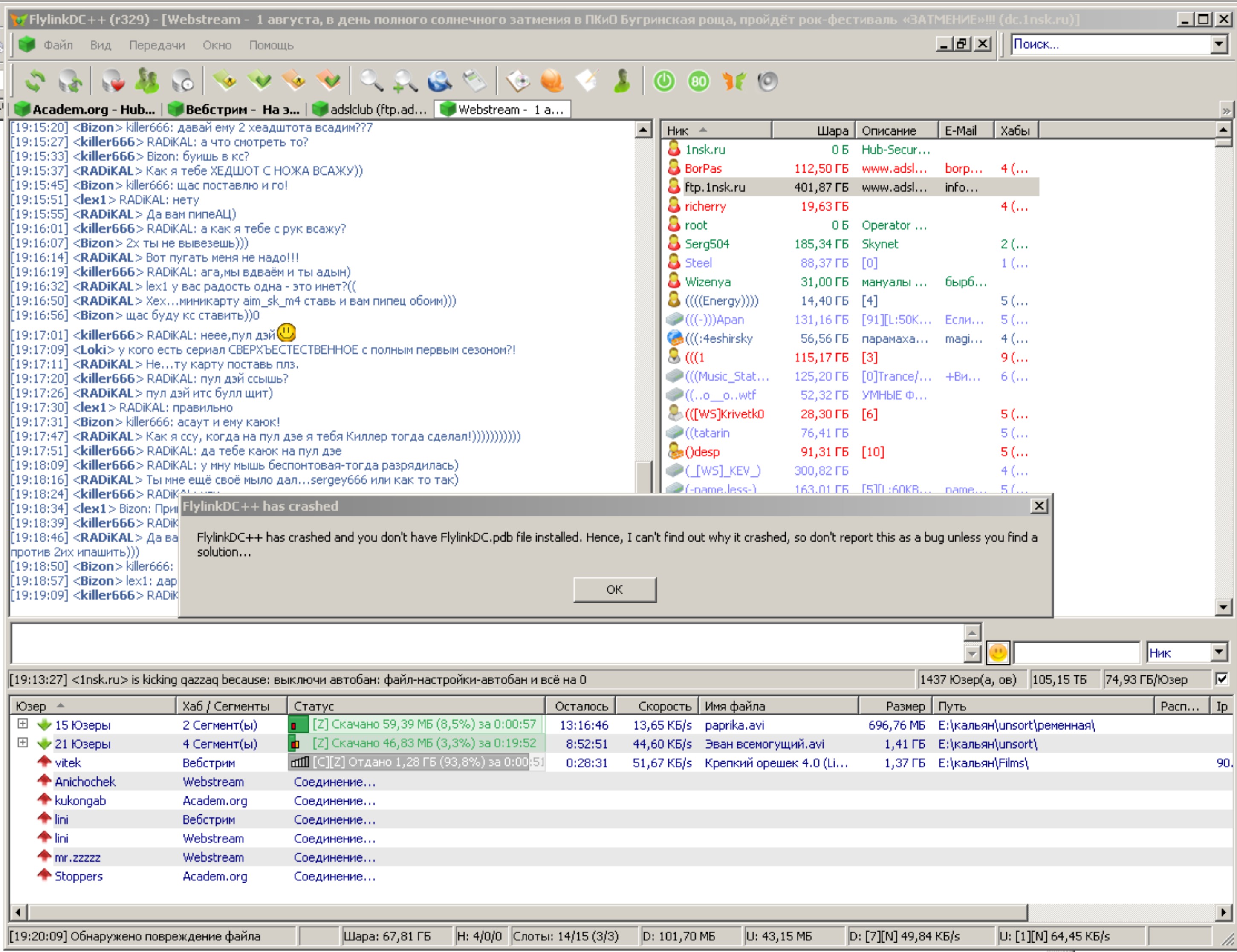 Столкнулся с проблемой Запускаю FlylinkDC++ , работает какое то время, еле еле что то качает, потом выдает вот что (см.приложение) при нажатии кнопочки "Ок" вобще вылетает, и так уже в течение нескольких дней.. подскажите кто знает, как исправить эту ошибку?