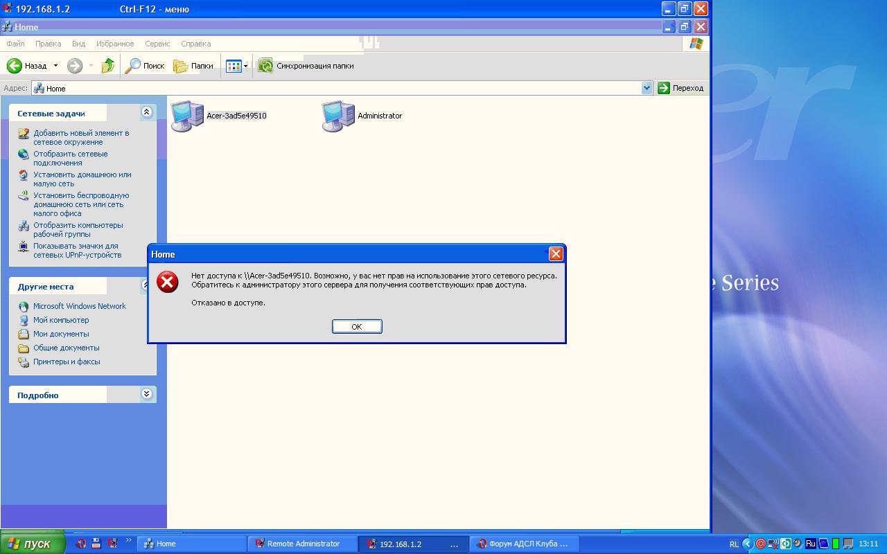 | Мишаня компьютеры в одной рабоче группе.. про ping спасибо что напомнил.. с одного компа пингуется соответственно с acer на admin а обратно нет.... |