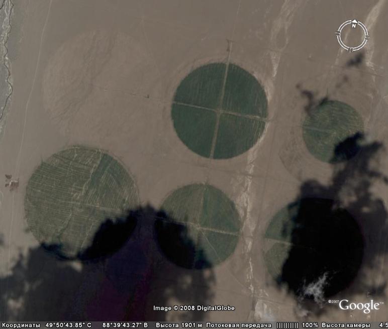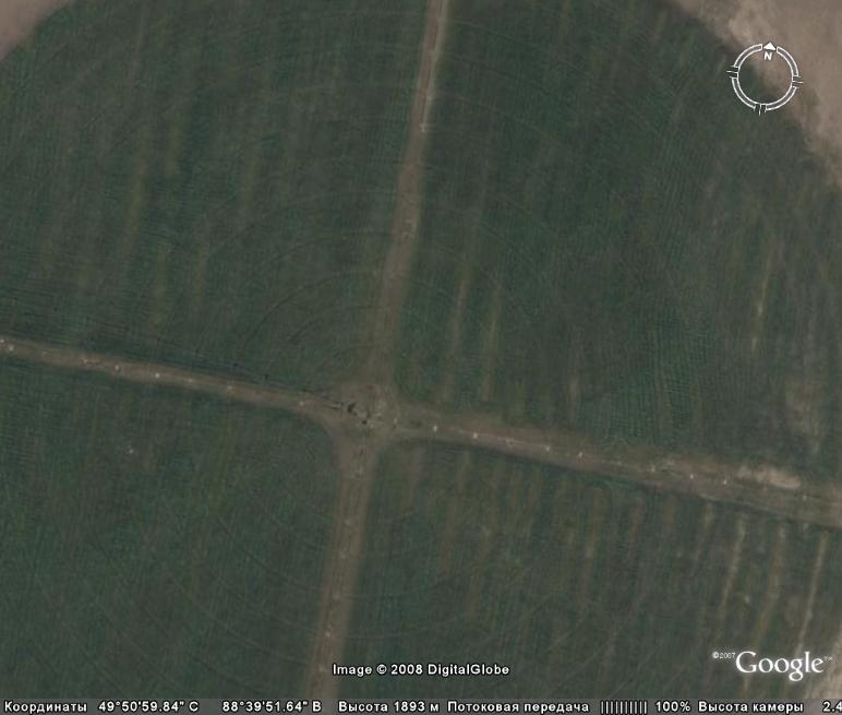 Что за страннsе круги? Кто знает? Сфотано с Google Earth, Алтай, почти граница с Монголией. Что самое интересное, что вокруг нифица, высокогорная степь и все.