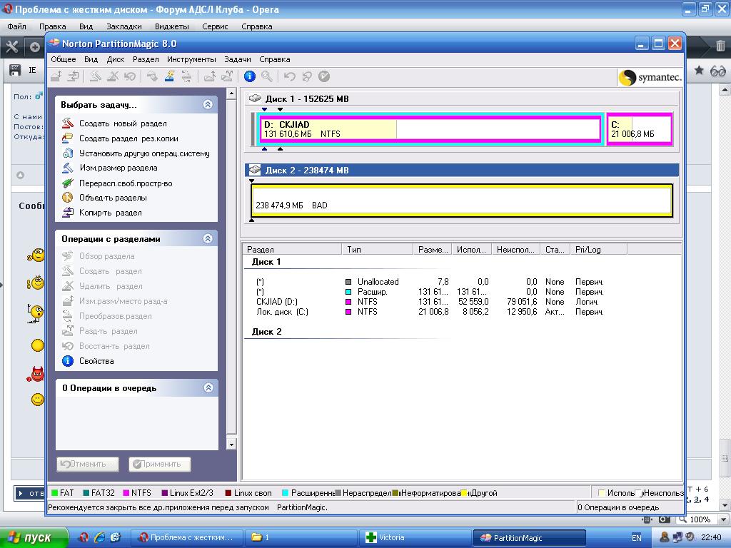 Norton PartitionMagic 8.0 показывет что на второй картинке, но если нажать форматировать, то он предлагает это сделать после перезагрузки, но прри включенном диске опять бегунок бесонечно бегает. На первой картинке виктория определяет диск как виртуальный.