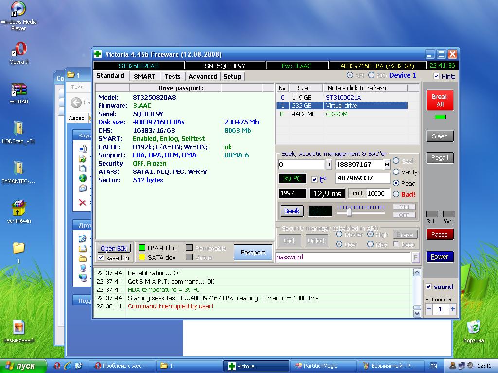 C дискеты MHDD не грузит, пока подключит диск, комп виснет при попытки загрузится с флопаря. Можно подробнее как MHDD из под виндовс пользоваться. Есть какие-нибудь проги которые из под винды могут винт вылечить, так как получается его увидет, в диспетчере устройств лишь включив диск при уже загруженной винде.