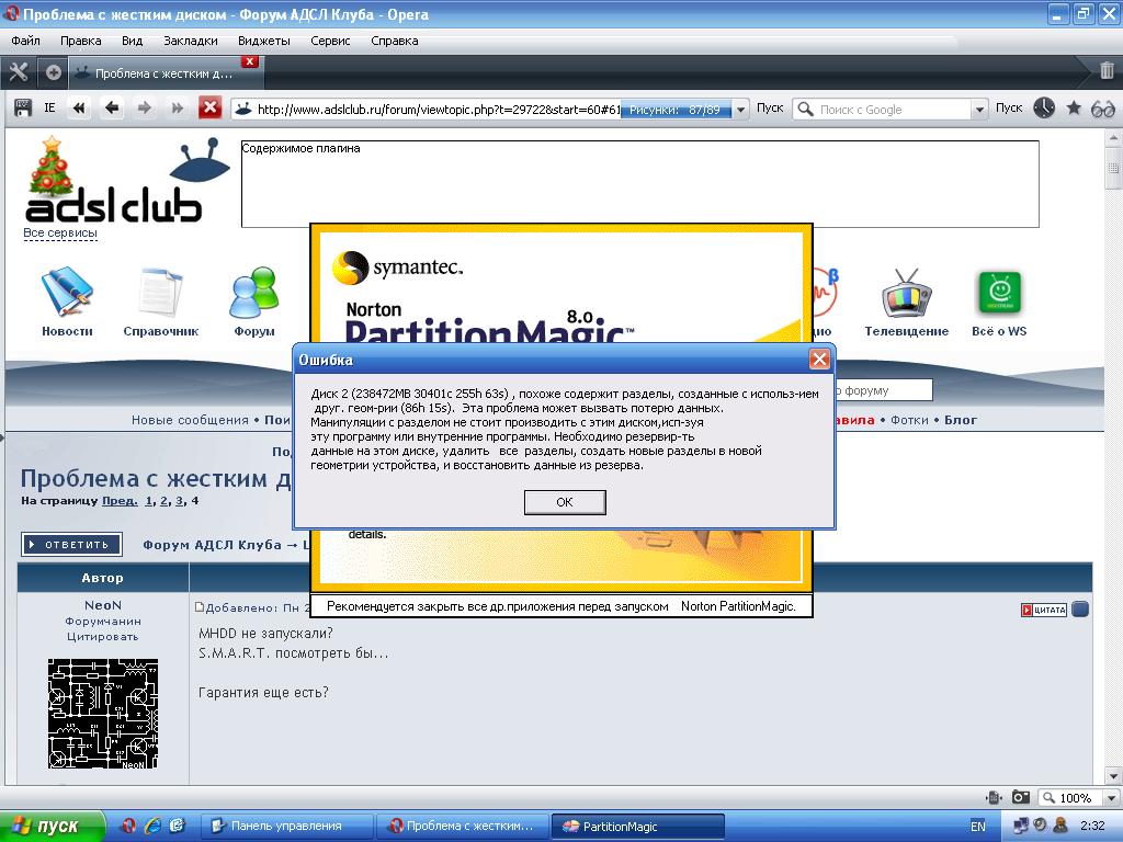 Хотел Партишином 8 обьеденить 2 диска в один (диск - ST3250820AS 232 Гб, разбит на 3 был). Но объденение не произошло, выдало какую-то ошибку. После этого, если диск подключён, то виндовс не загружается - бегунок бегает безконца. И с загрузочного диска не грузит Партишин, если отключить диск, то грузит всё норм. В биосе диск определяется.