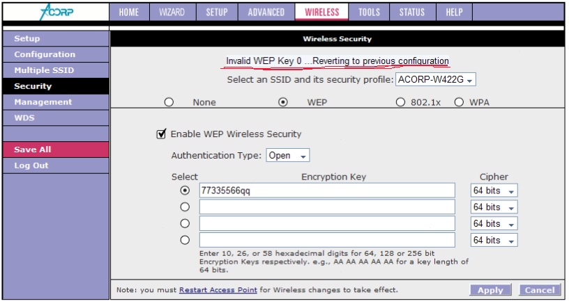 Enter 10, 26, or 58 hexadecimal digits for 64, 128 or 256 bit Encryption Keys respectively. e.g., AA AA AA AA AA for a key length of 64 bits.