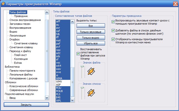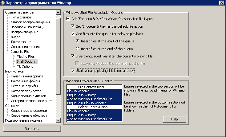 Здравствуйте! В контекстном меню проводника Виндовс ХР SP3 RUS (правая кнопка мышки),если я нажимаю на музыкальном файле типа .mp3 нет слов: "Открыть в Winamp,Добавить в Winamp,В закладки Winamp,Enqueue in Winamp."А надо.Причём на папке с музыкальными треками нажимаю-всё в порядке,все эти слова есть.В настройках Винампа Сервис-настройки-Shell Options: - и в Файл контекст меню и в Фолдер контекст меню добавлены все эти фишки и везде птички стоят где возможно.