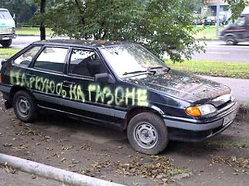 Еще вариант распечатай бумажку А4 "Цивилизованные люди на газоне не паркуются" положи на капот, а сверху кирпичем придави. Только незаметно, а то огрести можно