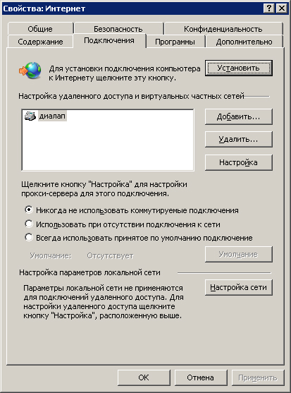 | Салют всем! Есть комп с внешним диалап модемом и выделенкой (кабель).Опера время от времени лезет в модем трезвонить...хотя сайты юзер открывает нормально с выделенки.Как это отключить? (отключить модем не предлагать-нужен).В Свойствах обозревателя>Подключение,стоит - Никогда не использовать коммутируемое соединение.Чего делать-то? |