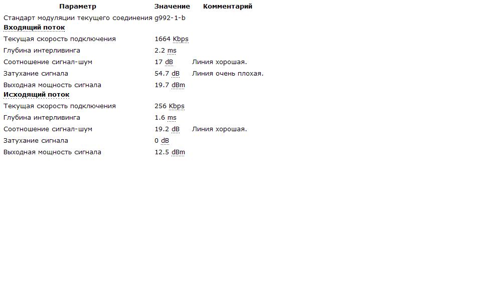 Итак если параметр DownStream Attenuation у Вас до 20 dB то линия (имеется ввиду линия от вашего модема до ближайшей АТС) у Вас отличная, если от 20 до 30 dB то можно говорить о том что линия у Вас хорошая, если ненамного больше 30 dB то линия не очень хорошая, ну и так далее.... Таким образом, чем ниже данный показатель, тем лучше.