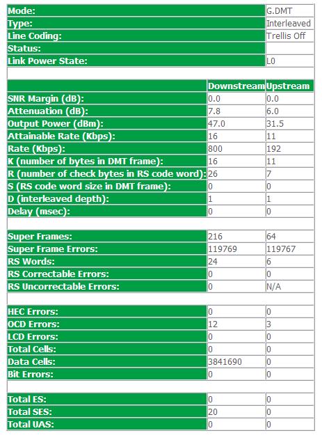 У вас либо чтото с прошивкой модема либо линия просто не показывает параметры, вы из области?(сюдя по логину-да) также имеется большое количество ошибок, если я не ошибаюсь...профиль на скачивание стоит 800кбит в секунду. Подождём что скажет rendy |