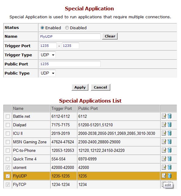 у флая стандартно в настройках стоит тсп1234 удп 1235
