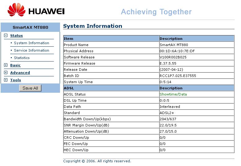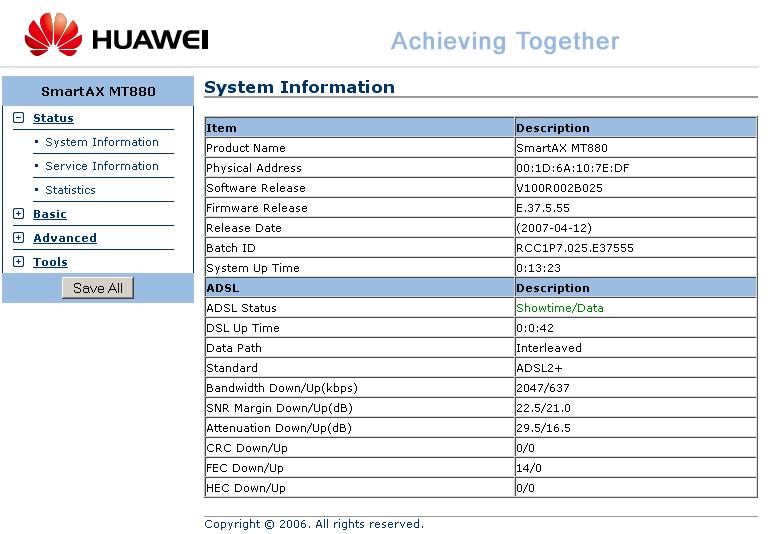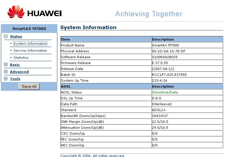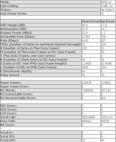 Воздушки нет. Скруток нет. От щитка до сплиттера витая пара, от сплиттера до модема Rj, обжато всё качественно. Модем фунициклирует нормально вроде, ничего с ним плохого не приключалось (хотя соблазн выместить злось на эту беленькую коробочку был, и не слабый ) Со сплиттером тоже все норм, тк тестил подключение напрямую, без сплиттера. Настроено соединение роутером. Судя по attenuetion, SNR итд (что видно на вложенных картинках) линия телефонная в поряде для моего Тарифа Webstream Трасса 1024 (физ. лица) ///или мне кажется?*///
