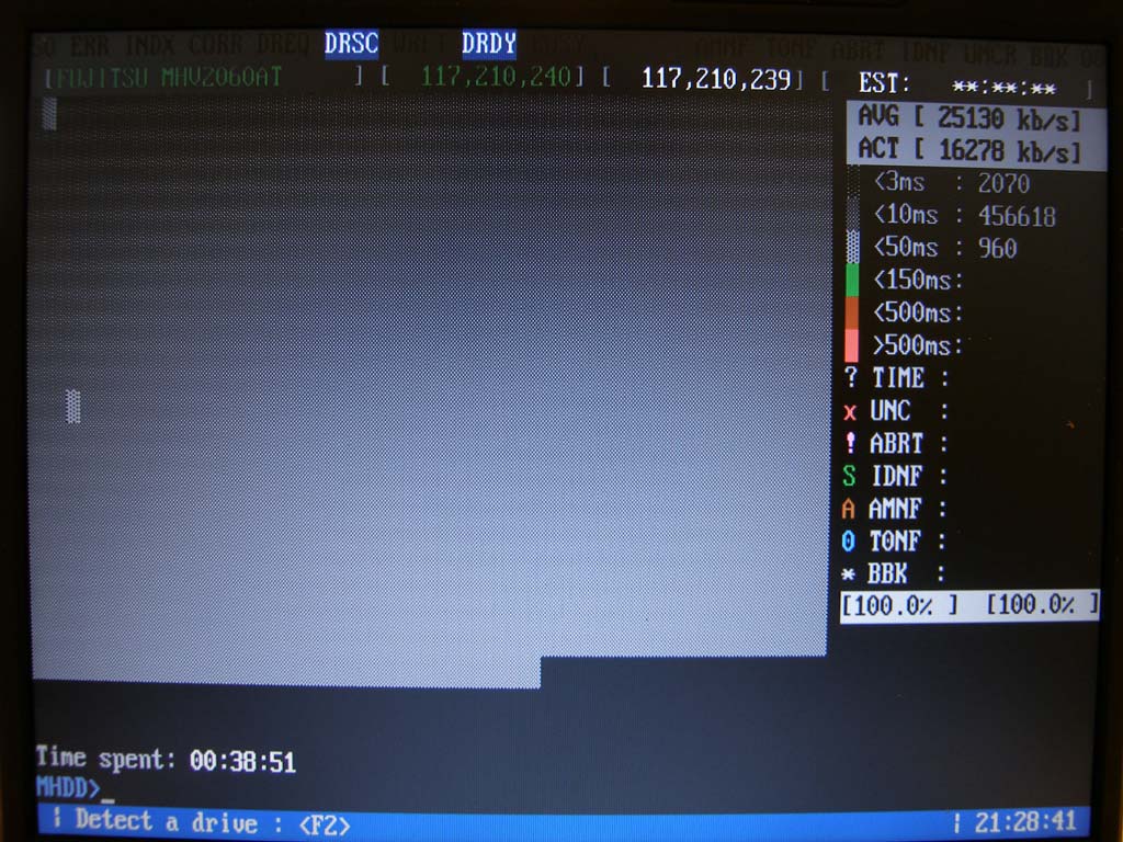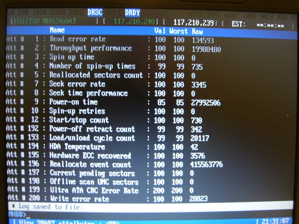 А у этого 2,5" винта нет ни одного переназначенного сектора. И карта нормальная. Может программа неправильно интерпретирует SMART Fujitsu. Или в самом SMART'е косяки.