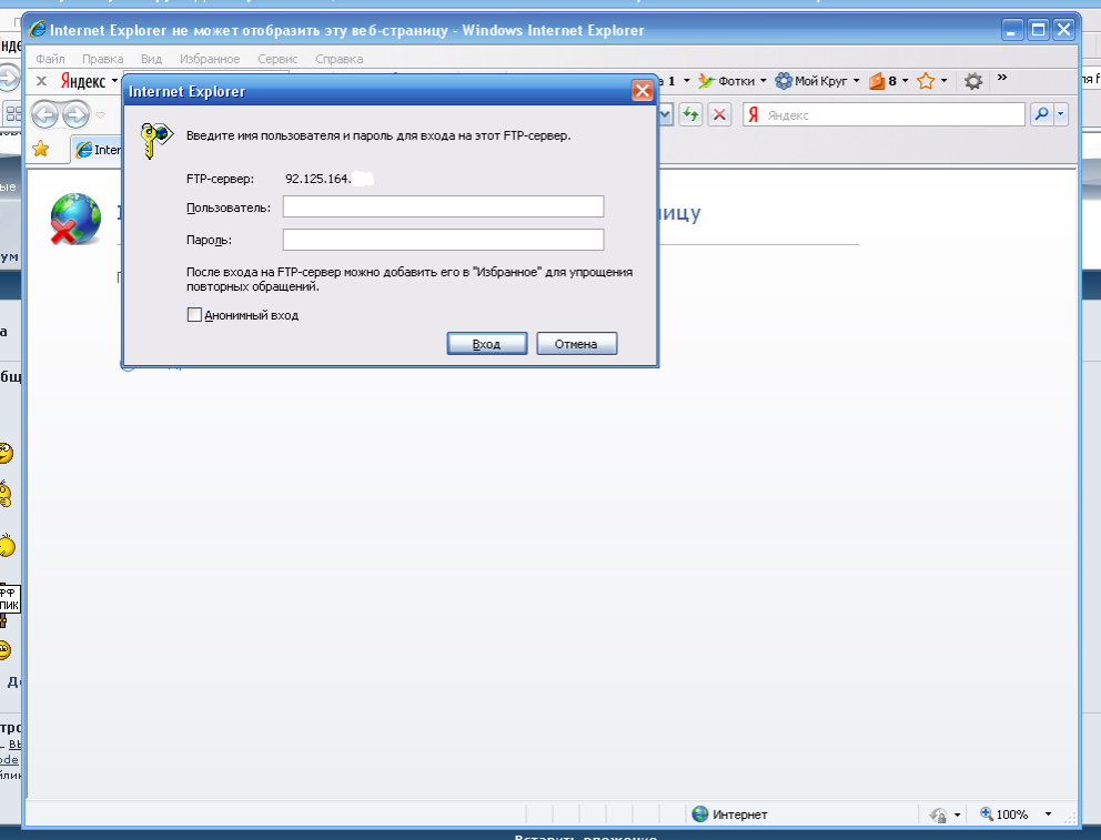 Задача такая. Я хочу на своем компе создать ftp сервер, но никогда этого не делал. А нужно это чтобы я с рабочего компа мог шариться по своему компу дома. Оба компа выходят в инет через адсл модемы. У каждого есть внешние ip. Оба компа ещё и в локалке сидят. Я поставил программу Golden FTP Server Pro и сейчас набирая в браузере 192.168.1.2 я вижу расшаринные папки, но когда набираю внешний ip (пример ftp://92.125.164.ХХХ/Games), появляется окно с просьбой ввести логин и пароль, что только не вводил, но попасть не могу, и логин из программы Golden FTP Server Pro , и логин пользователя windows xp и вообщем всё что можно - не помогает. Вопросы: Надоли настраивать адсл модем и как, какой логин и пароль надо указывать в том окне. И если можно то очень подробно. Заранее спасибо.