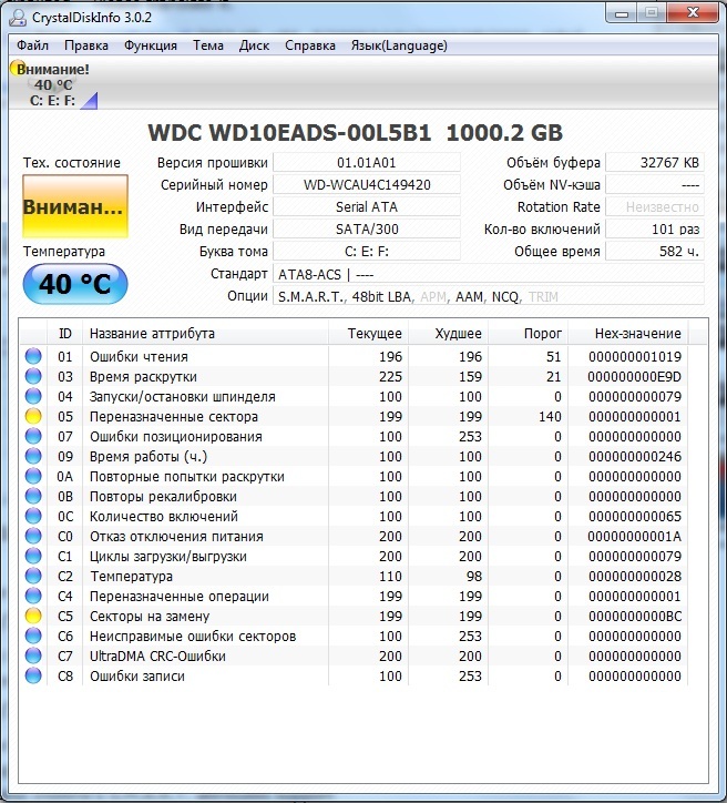 Нельзя сказать однозначно, готовится ли винт отправиться в утиль или проработает ещё несколько лет. Всего 1 переназначенный сектор, зато 1888 секторов на замену! И дофига >4000 ошибок чтения. Хотя... Для современных винтов такое кол-во ошибок является нормой.