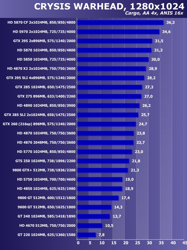 Если смотреть отдельно, то 4890 в среднем немного уступает ГТХ275. 9800ГХ2 сразу в мусор - энергопотребление+тепловыделени против посредственной производительности. 5770 свои деньги отрабатывает в, соотношение цена\производительность у неё наилучшее, чуть пониже 4890 идёт по производительности |