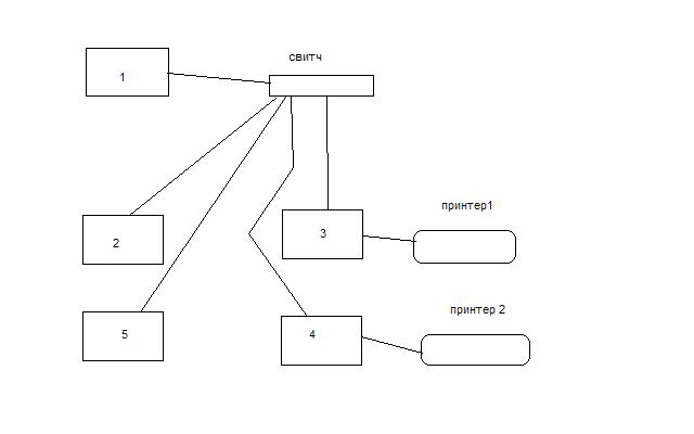 в общем прошу помощи.. потому что сам не могу понять что случилось... сеть работала стабильно (рисунок будет приведен часть сети) в один из прекрасных дней.. так и не выяснил в какой (бухгалтера блин сказали через несколько дней только) два компа начали гнать чушь... точнее они вообще как бы не видят сеть! и их никто не видит! на одном из этих двух (3 на картинке) отключился инет на втором инет работает (на картинке 5) подсеть ip адреса прописанны верно... проблема в том что нет доступа к общим папкам которые находятся на 5 компе с компов 2 4 ну и не могут печатать на принтерах общих... что случилось понять не могу.. пробовал уже и рабочую группу менять не помогает... жду подсказок мыслей нет
