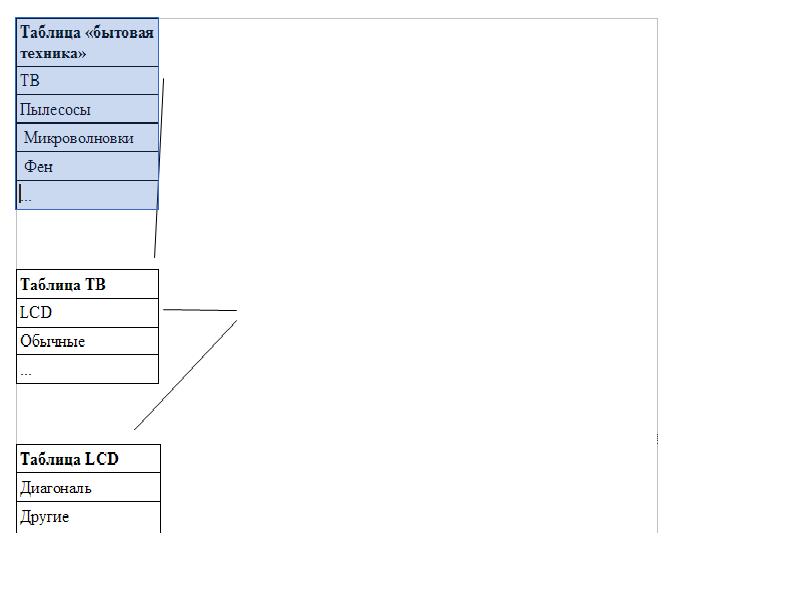 далее таблица ТВ состоит из столбцов lcd обычны и тд (сама таблица должна быть связана с первой по ключу 1 но при этом у нее должен быть ключ2 который связывает ее с 3 таблицей) и так для всех вложенных таблиц?! |