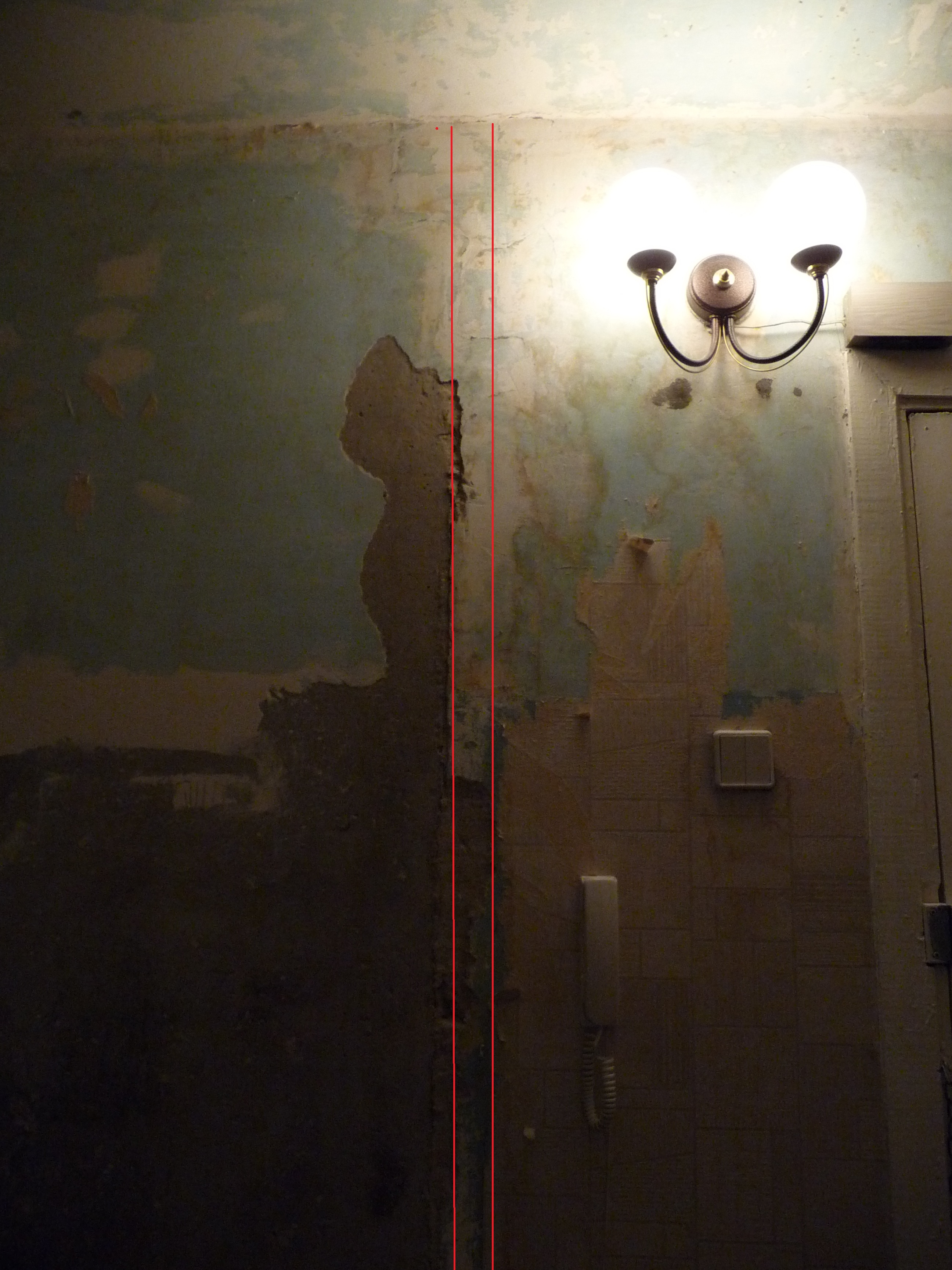 Стена обсыпалась, но чуток не там... Буд аккуратен при сверлении - в этом месте стык двух плит, поэтому там штукатурка, которая больше напоминает песок. На фото это между двух красных полос