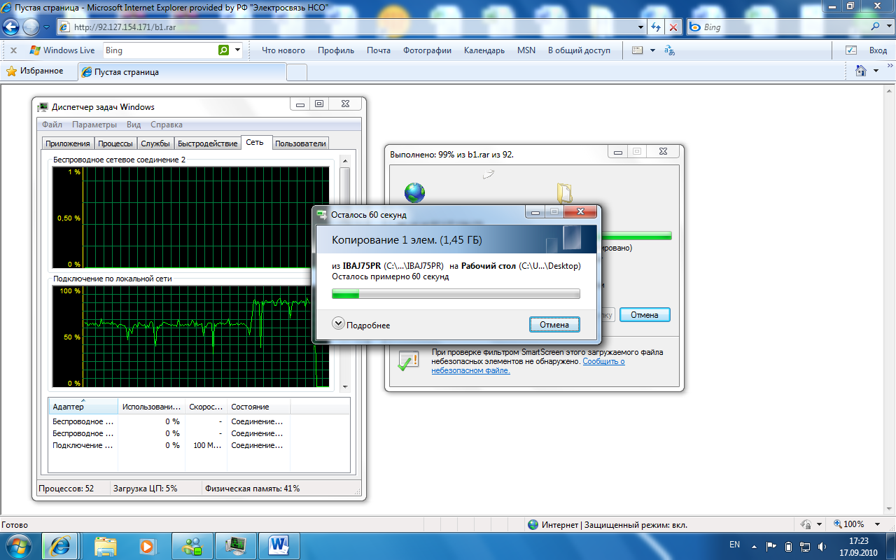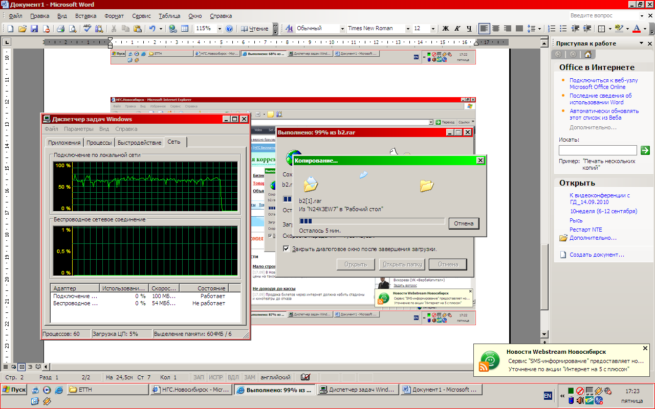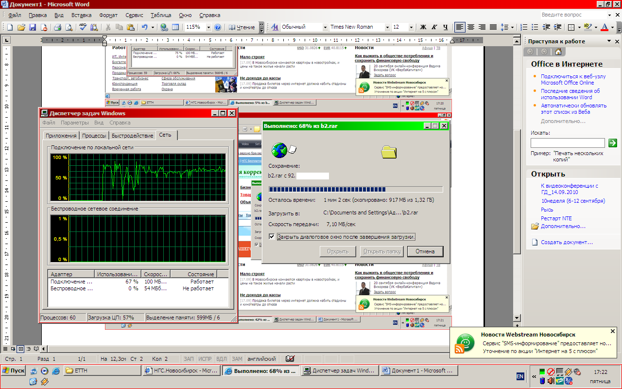 Результаты тестирования представлены на скриншотах. На скриншотах видны провалы трафика. Причина этих провалов запуск приложения MS-WORD для сохранения скриншотов, учитывая то, что ноутбуки достаточно слабой производительности. В нормальном режиме работы оба ноутбука утилизировали полосу более 100-110 Мегабит в секунду. Так же нужно учесть, что во время теста работали обе приставки STB подключенные к данному NTE-RG-1402F. Как вел во время теста ПК под управлением ОС Windows 2008R2 Server мне не известно, а так же IIS-7 не подвергался каким либо настройкам. IIS-7 с моей точки зрения не является высокопроизводительным HTTP сервером, а ПК не является полноценным сервером.