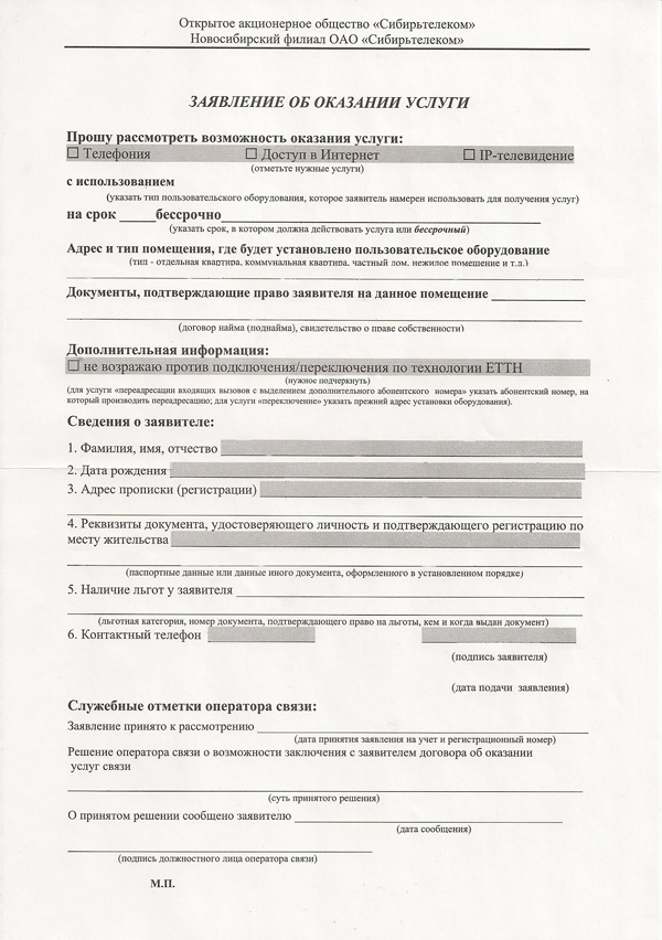 1) То, что в заявлении в пункте дополнительная информация есть "не возражаю против подключения/переключения по технологии ETTH", это так же подразумевает, что абонент уже может быть подключен по технологии ADSL - Это просто стандартный бланк заявления!