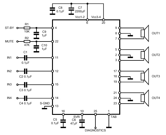 Подскажите что подавать на 1 , 4, 22 входы и куда питалово подключать? микруха tda7388