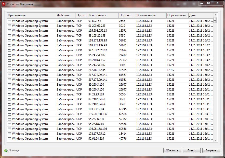 Вы выходите в инет через маршрутизатор с NAT (о чем говорит ваш ip 192.168.1.33). Если к вам доходят извне пакеты на определенный порт, то этот порт, видимо, промаплен (сознательно). Для какой программы он был промаплен?