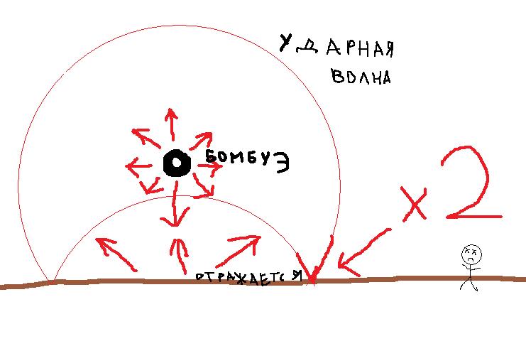 | при воздушном взрыве часть взрывной волны, достигшей земли, отражается и складывается с энергией фронта, направленного в стороны от эпицентра взрыва. Примерно в 2 раза сильнее вронт ударной волны получается |