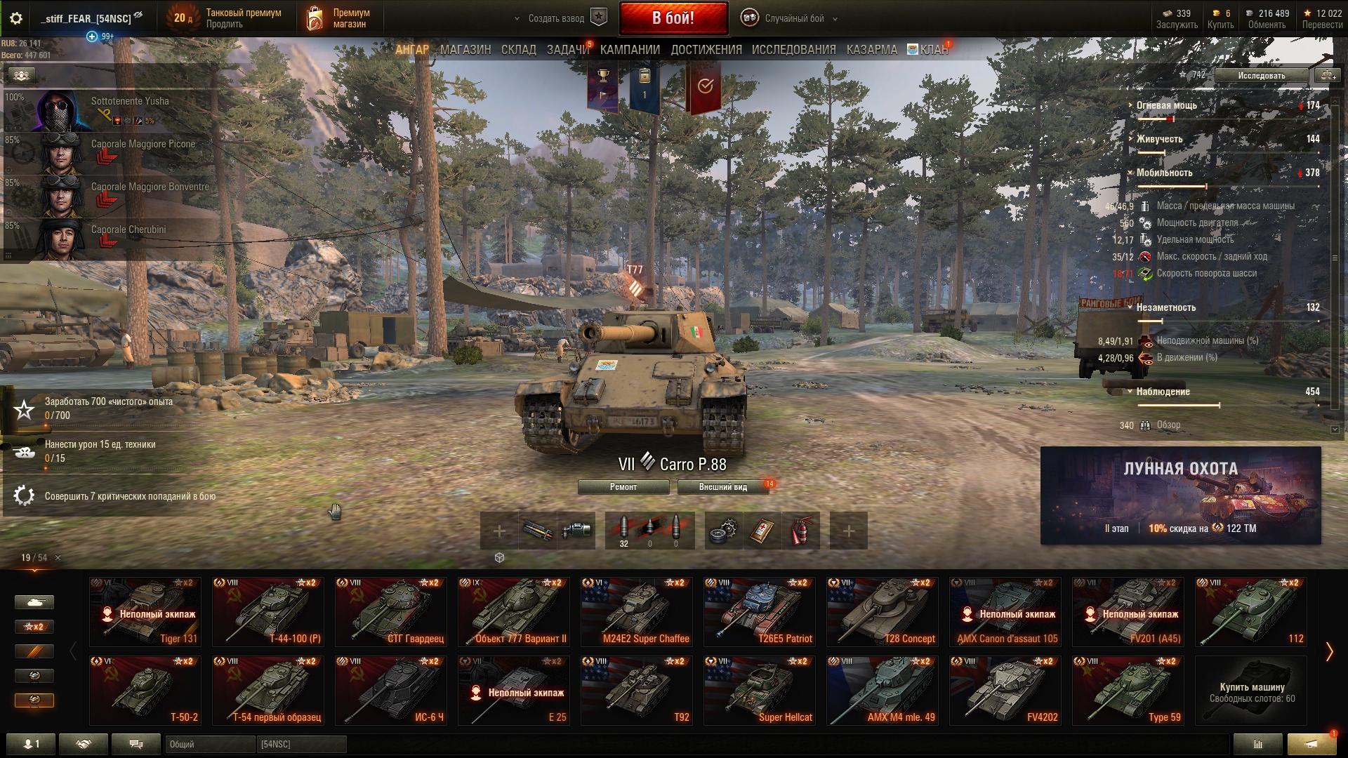Минусы. Брони нет вообще, зрение нет вообще рога спасают чутка, хваленая маскировка на 400м с сеткой и с прокаченным экипажем светится как новогодняя елка