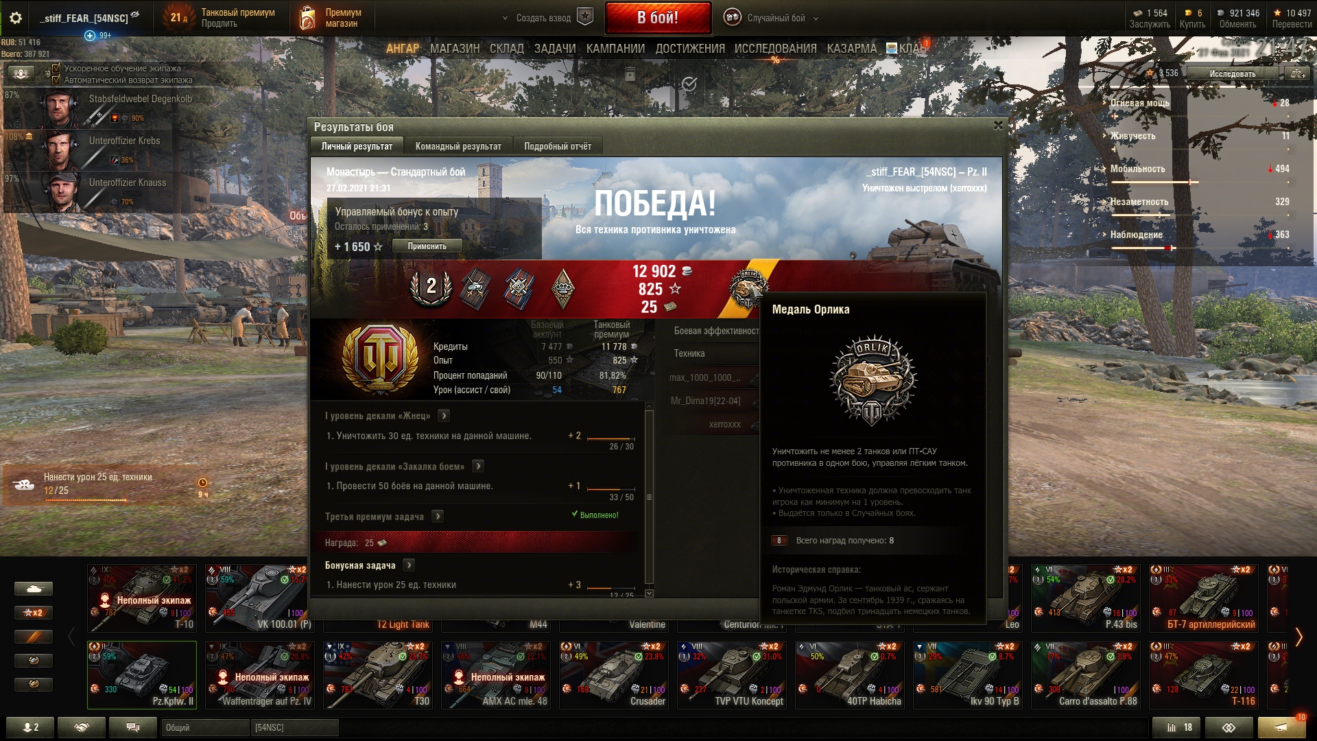 Вот бой 2 очка огонь на поражение 2 очка победа 10 очков за медалька Орлика уничтожил 2 танка выше уровнем. И того 14 очков, каждый бой так не получается конечно, а еще там воин подержка основной калибр бывает и 34 очка с боя, воин, стальная стена, основной калибр.