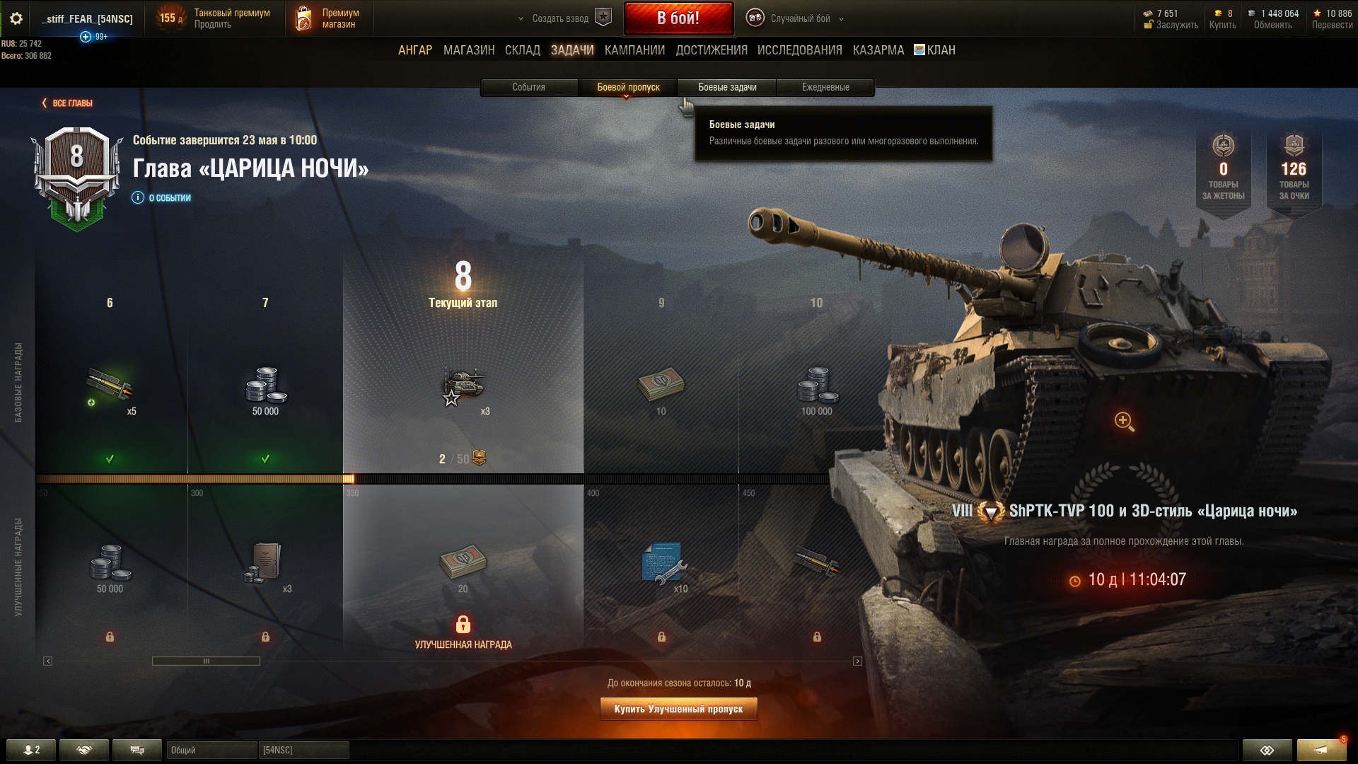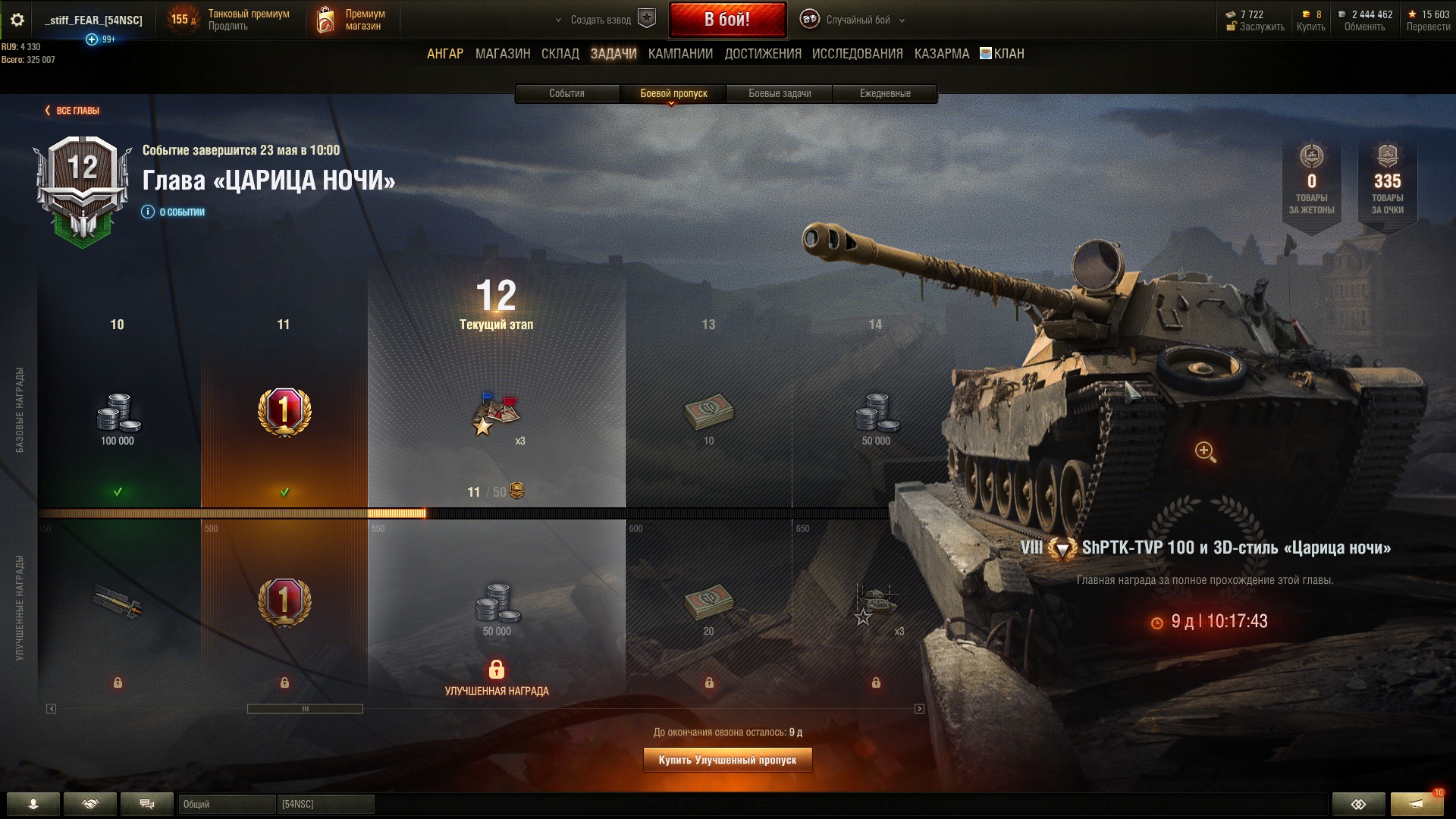 И так ежедневные боевые задачи это 10+15+20+25=70х10=700 далее за заполнение 45 получаем 50 и того я подгадал 50 в первый день и 50 еще через 7 дней и того уже 800 + у меня на 5 танках 6лвл по 20 это уже 900 на 8 лвл на 4 танках это уже 1000 и того мне надо накать всего 1000 очков за 10 дней. 100 очков в день считаем по среднему 5 очков это 20 боев в день. Добавим сюда кранваген и т110е4 это отнимет еще 5 боев.