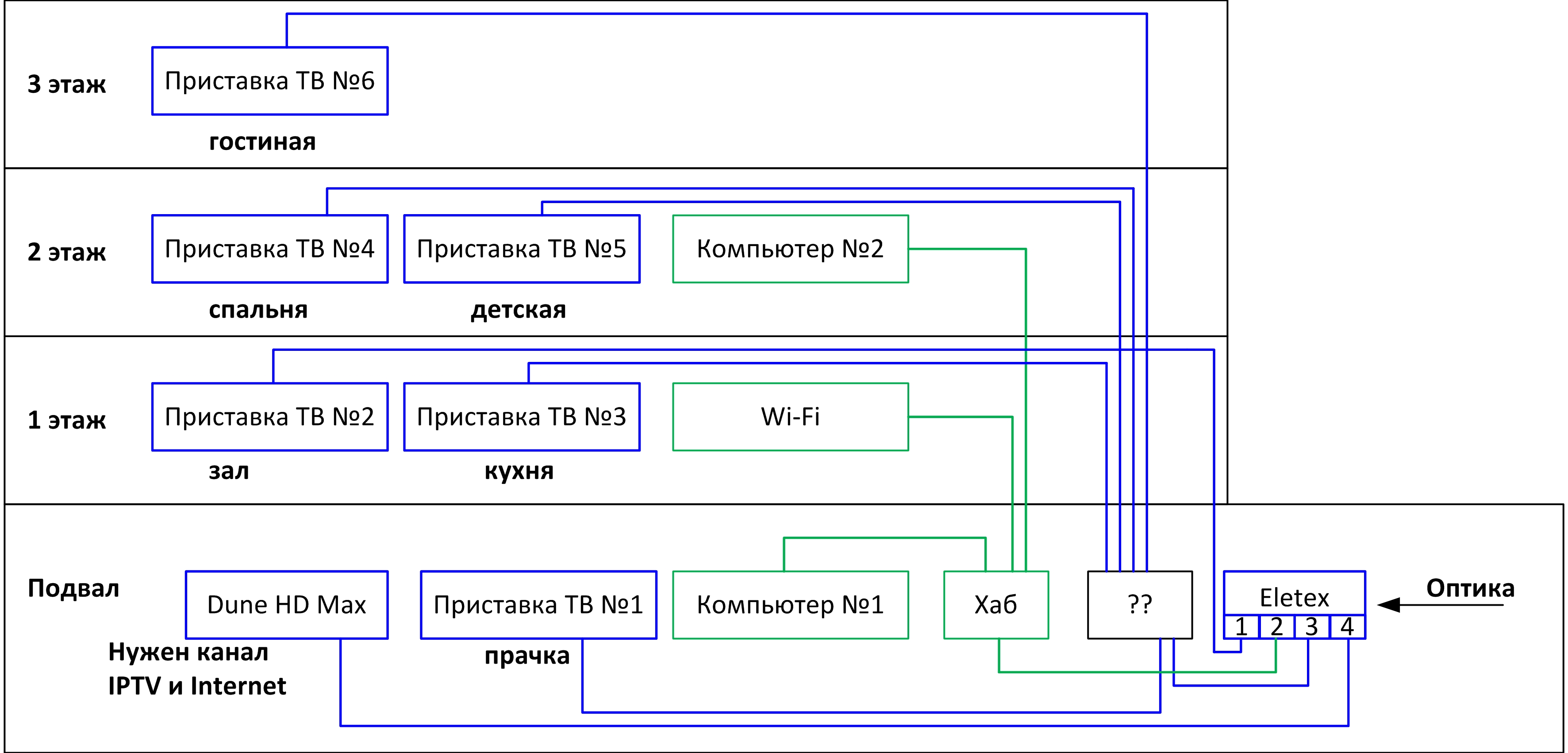| Все подкючили через хабы. Пока-что реализована одна приставка. Но и она через хаб работает. Как докупим телики и приставки напишу о результате |