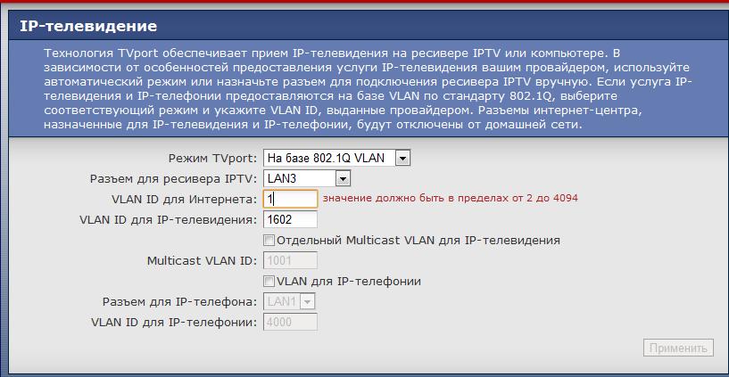 // труба значит. пощёлкай тогда режим TV-порта так чтобы было только поле для ввода VLAN ID для TV. или пиши в поддержку Zyxel почему у них 1 нельзя вписать если у D-Link можно