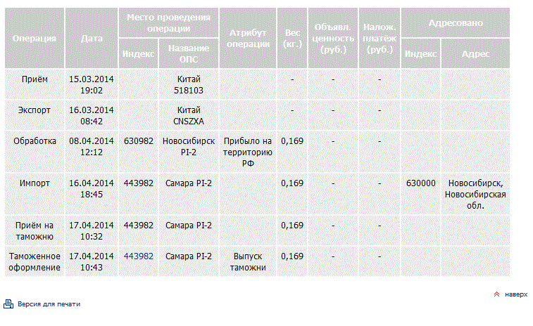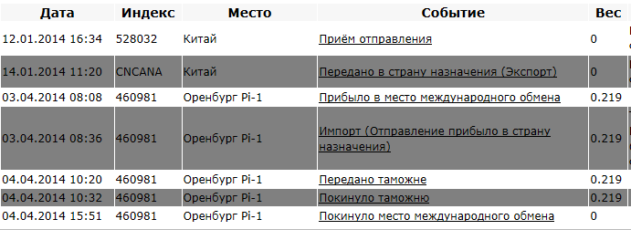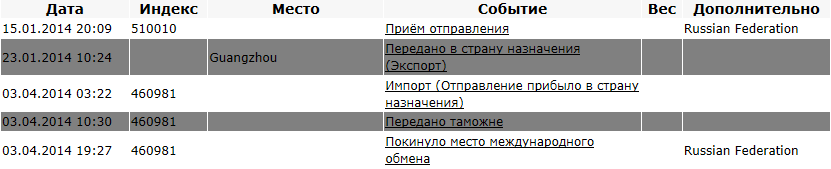 Ваше почтовое отправление с номером RX194048943CH изменило статус на Вручение. Дата операции: 11.04.2014 00:00:00. Место операции: ОПС ОБЬ индекс 633100. Всю историю операций над Вашим отправлением Вы можете посмотреть на сайте Почты РФ.